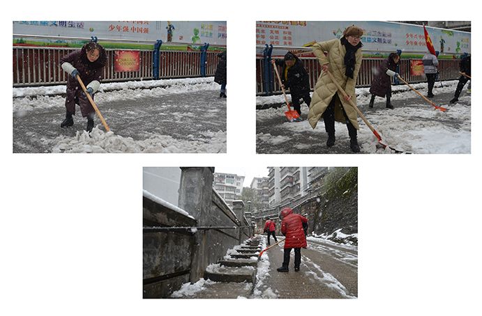 各攻堅(jiān)隊(duì)帶領(lǐng)隊(duì)員手拿鐵鍬竹帚提示牌,分組前往蘋果山花園1-3號(hào)樓、州建社區(qū)、文化南路道路兩側(cè)、石階步道等處,沿著道路對(duì)沉墊在人行道上的厚厚積雪進(jìn)行清除,此次積雪遠(yuǎn)比前兩次厚重許多。志愿者們迎著大雪紛飛,用熱情行動(dòng)融化持續(xù)飄落在臉頰上的雪花,清掃出1公多里長(zhǎng)3米寬的社區(qū)道路和沿街步道,保障了市民群眾和社區(qū)居民安全暢行。