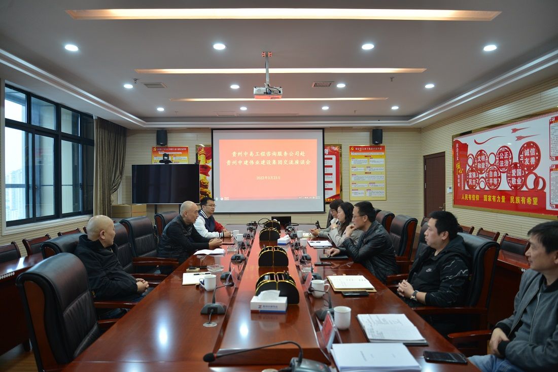 2022年3月23日,貴州中易工程咨詢服務(wù)公司董事長(zhǎng)陳志平帶領(lǐng)公司資深專(zhuān)家鄧曉東、吳遼,到貴州中建偉業(yè)建設(shè)(集團(tuán))公司考察交流,集團(tuán)公司黨委副書(shū)記、總經(jīng)理馮安翔熱情接待,黨委副書(shū)記、工會(huì)主席王莉,黨委委員、副總經(jīng)理王振田,總監(jiān)周世玲,質(zhì)安部經(jīng)理蔣煒參加座談。