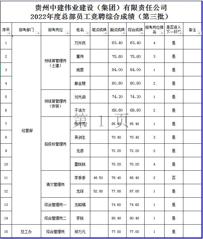 根據(jù)《貴州中建偉業(yè)建設(shè)(集團(tuán))有限責(zé)任公司總部員工競(jìng)聘方案(第三批)》規(guī)定,經(jīng)報(bào)名、資格審查、面試等程序,現(xiàn)將綜合成績(jī)予以公示。