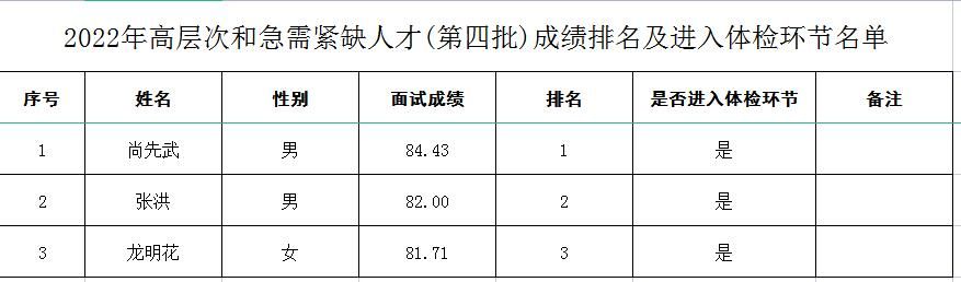 2022年高層次和急需緊缺人才(第四批) 面試成績(jī)及進(jìn)入體檢環(huán)節(jié)名單公示